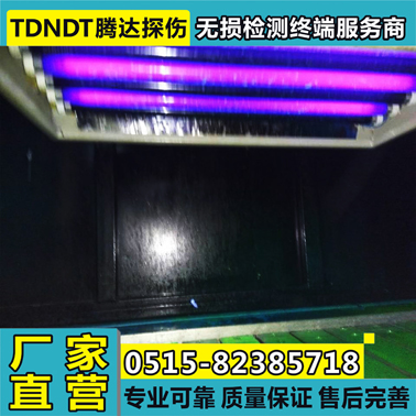 荧光探伤,是指将溶有荧光染料的渗透剂渗入工件表面的微小裂纹中,清洗后涂吸附剂,使缺陷内的荧光油液渗出表面,在黑光灯照射下显现黄绿色荧光斑点或条纹,从而发现和判断缺陷的方法。荧光探伤是利用荧光物质在紫外丝照射下发光的性质,将荧光物质涂在零件表面上,借助荧光检验零件表面缺陷。